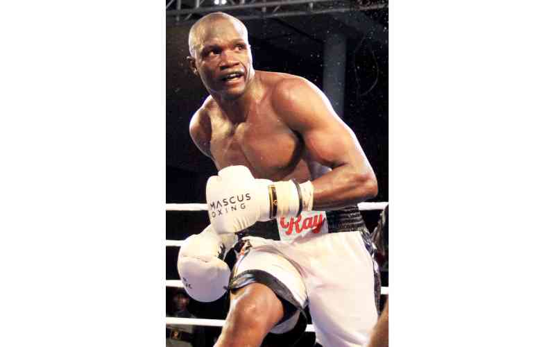 Kenya's Rayton Okwiri in a recent bout with Meshack Mwankemwa of Tanzania at Charter Hall, Nairobi. [Jonah Onyango, Standard]