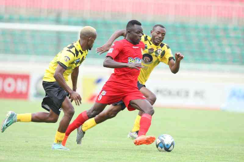 David Okoth of Kenya Police FC dribling ball past Esraeal Shalile (left) and Melaku Gao of Ethopian Coffee Sports SC from Ethiopia in the first leg of the CAF Confederations Cup preliminary round match at Nyayo National Stadium. Aug 18, 2024. [Jonah Onyango, Standard]