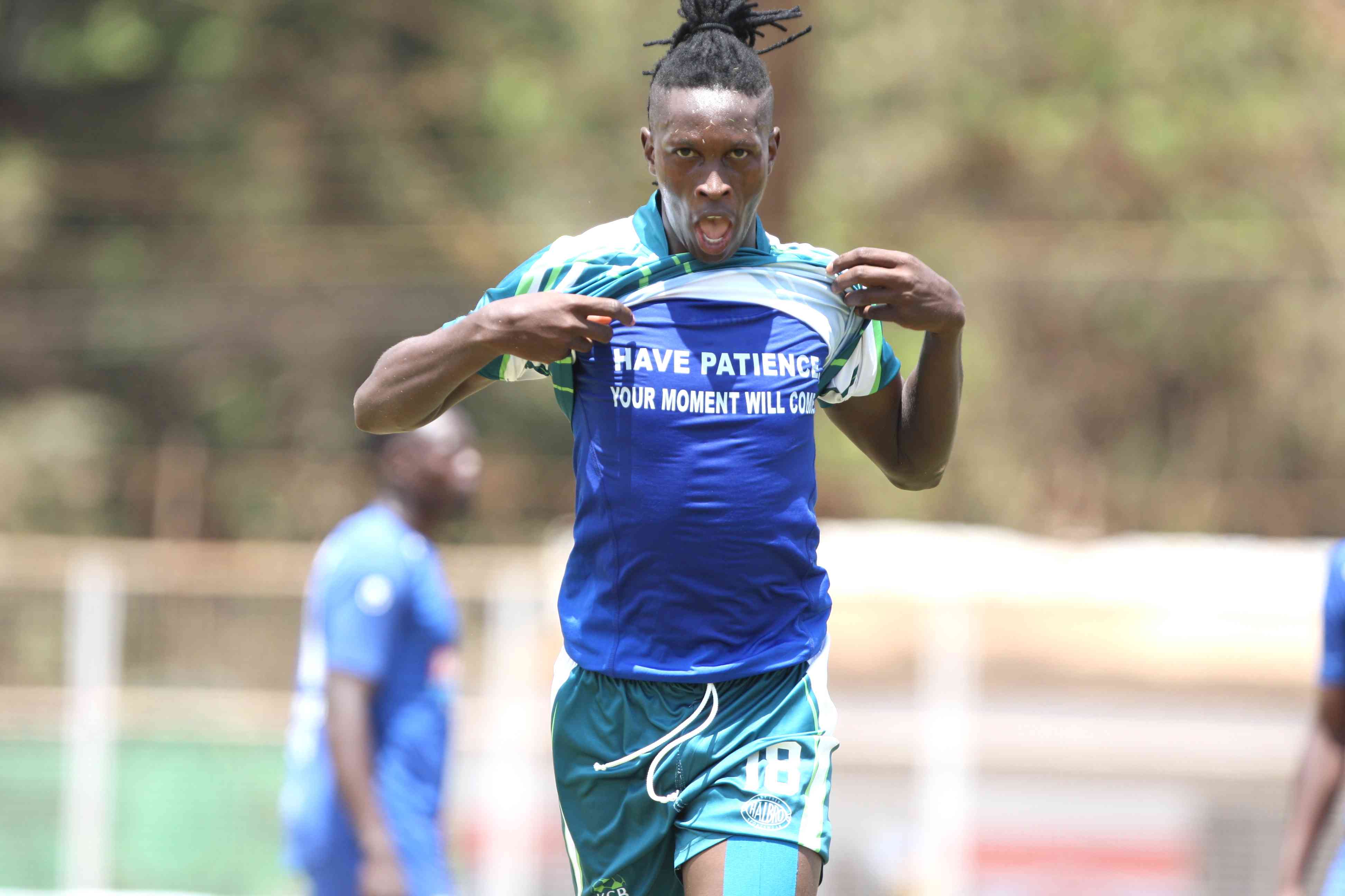 Francis Kahiro celebrates after scoring for KCB. [Jonah Onyango,Standard]