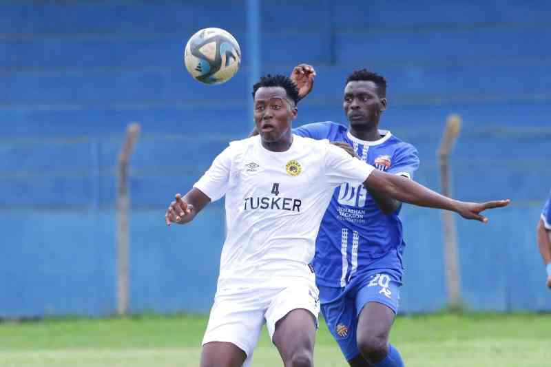 Mike Kibwage (L) of Tusker FC contets for ball with Kelvin Etemesi of Nairobi City Stars FC during their FKF Premier League match at Kenyatta Stadium in Machakos on November 23, 2024. [Stafford Ondego, Standard]