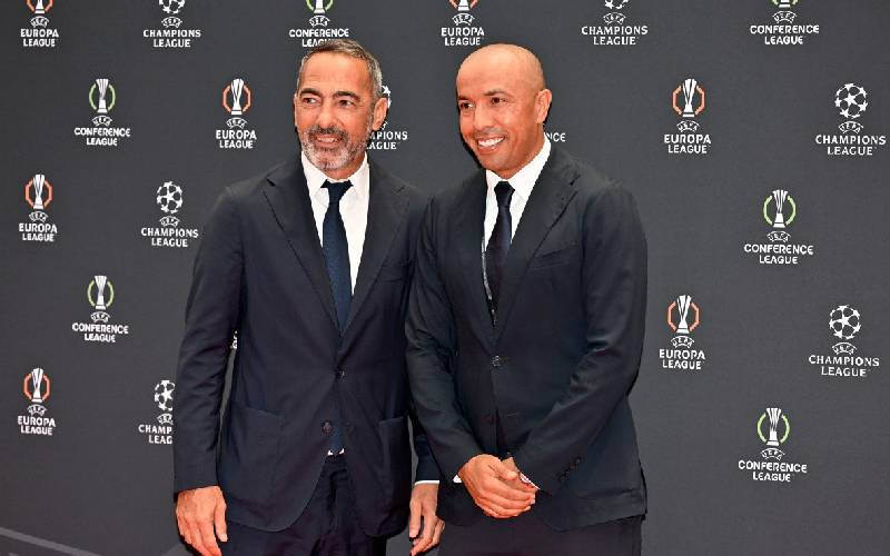 French former football player Youri Djorkaeff (left) and former Moroccan football player Houssine Kharja, at the Grimaldi Forum in Monaco on August 28, 2025. [AFP]