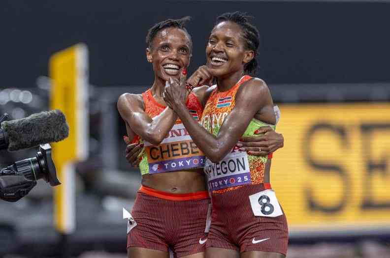 Faith Kipyegon (silver) congratulates Beatrice Chebet (gold) after the Women’s 5000m Final at the 2025 Tokyo World Athletics Championships. (Photo: Andrzej Iwanczuk/NurPhoto)