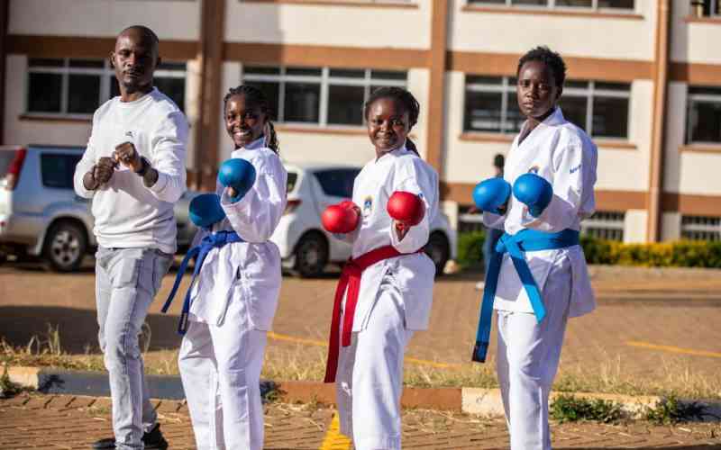 Mount Kenya university karate ladies team and coach after being declared women best team overall at the  KUSF national games on December 19, 2025. [Courtesy]