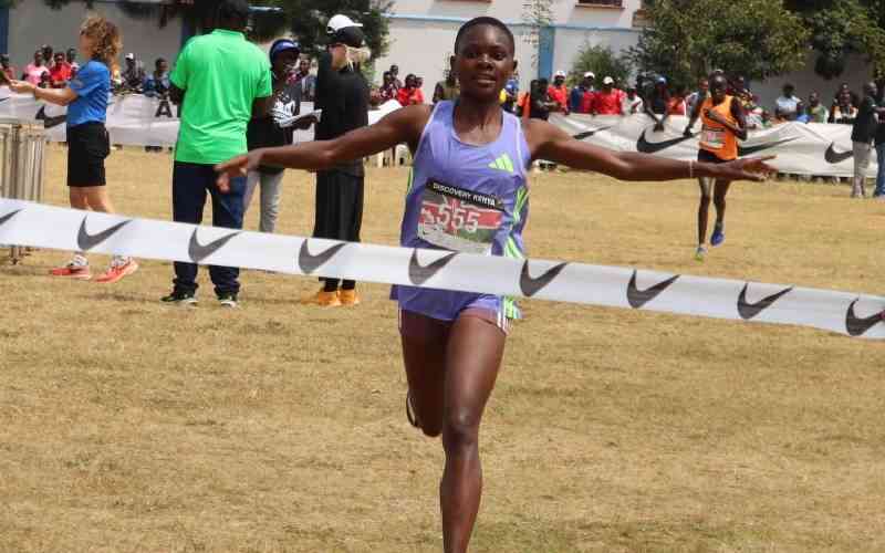 Christine Njoki crosses the finishing line during the 34th edition of Discovery Kenya Cross Country 2025 in Eldoret, Uasin Gishu County, on January 26, 2025. [File, Standard]
