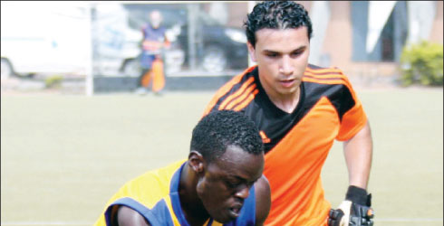 Nairobi Simba’s Castro Kaluna (left) goes past Sharkia’s Abdelaziz Hassan during the Africa Hockey Club Championships quarter-final match at Lugogo Stadium, Kampala, Uganda, yesterday.