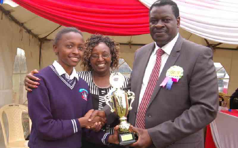 Biometric technology Ltd Chief Executive Officer Anthony Maina Mithanga presents a trophy to Birithia Girls School's Martha Jerotich who emerged the best student innovator during the school's 1st annual entrepreneurship day and prize giving day. [File, Standard]