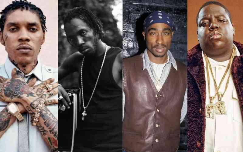 A collage of Vybz Kartel, Mavado, Tupac and Biggie.