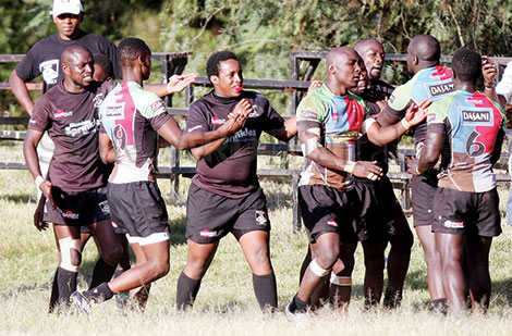 | Mwamba and Kenya Harlequin players exchange blows in their Kenya Cup match at RFUEA grounds, yesterday. [PHOTO: BONIFACE OKENDO/STANDARD] |