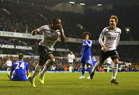 Tottenham Hotspur's Danny Rose (L) celebrates his goal with teammate Christian Eriksen during their English Premier League soccer match against Chelsea at White Hart Lane in London January 1, 2015.