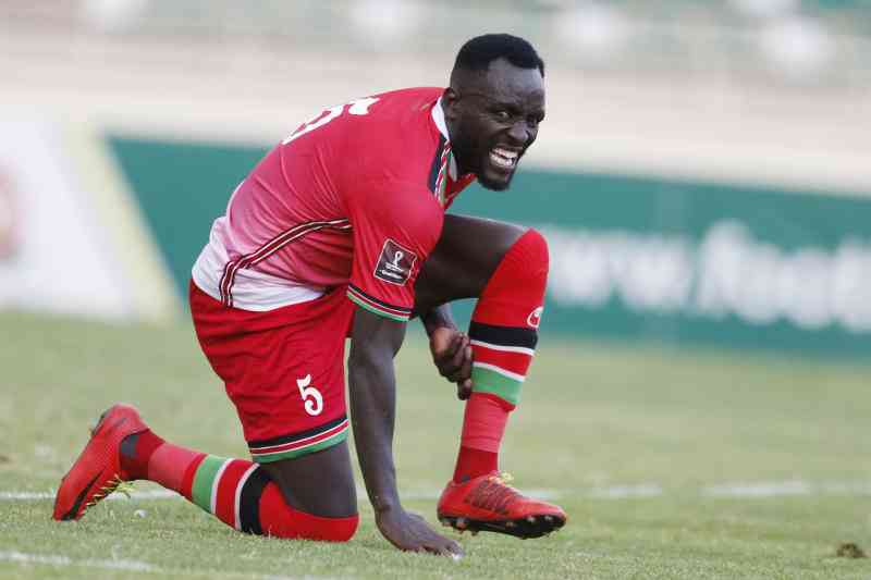 Harambee Stars defender Eugine Asike reacts after sustaining injury during their FIFA World Cup Qatar 2022 Qualifier Group E match against Uganda Cranes at Nyayo national stadium in 2021. [Stafford Ondego, Standard]