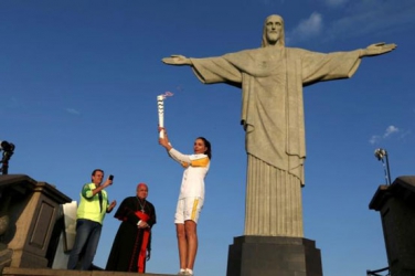 Olympic torch - Rio de Janeiro, Brazil 05/08/2016. Former Brazilian volleyball player Isabel Barroso holds the Olympic torch next to Christ the Redeemer statue watched by Rio Mayor Eduardo Paes (L) and archbishop Orani Joao Tempesta. Reuters/Pilar Olivares