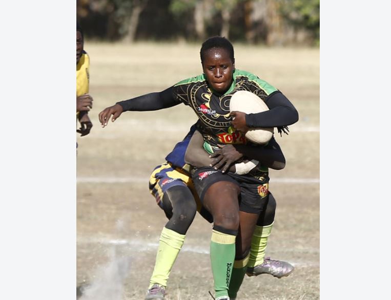 Olivia Igadwa (with the ball) of Nakuru RFC battle Joy Mitchell of Homeboyz in past action. [Kipsang Joseph, Standard]