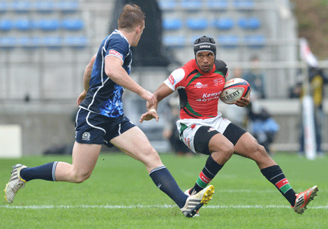 Biko Adema (right) and Scotland’s Michael Fedo during the Tokyo Sevens last year. Scotland beat Kenya 12-0. Adema will miss the event. [PHOTO: AFP] |