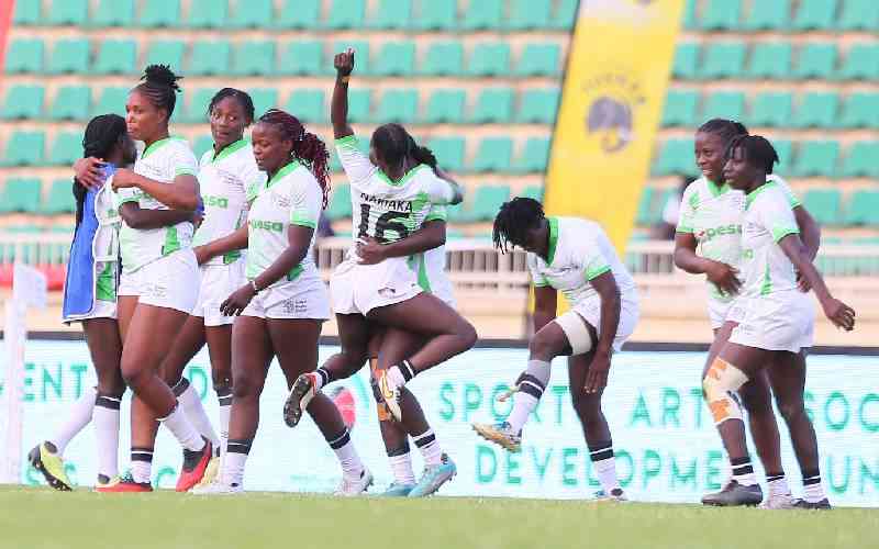 Kenya Lionesses celebrate after being crowned champions of the 2025 Safari Sevens Tournament finals at Nyayo National Stadium, on October 12, 2025. [Stafford Ondego, Standard]