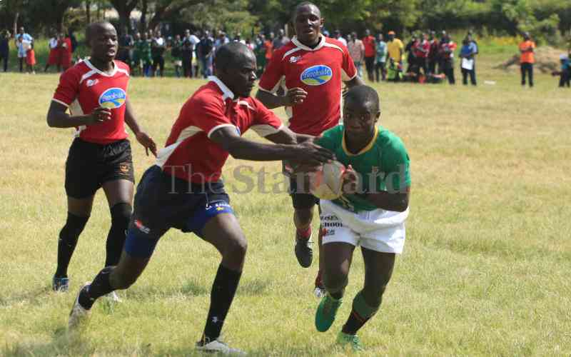 Maseno School scrum half Winston Ngulu (right) in action against St Mary's Yala.[Washington Onyango,Standard]
