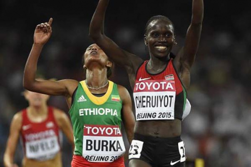 Kenya's Vivian Jepkemoi Cheruiyot celebrates in front of Ethiopia's Gelete Burka PHOTO: STANDARD