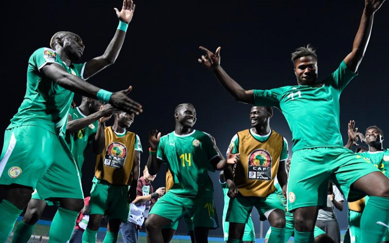 Senegalese players celebrate after winning the 2019 Africa Cup of Nations (CAN) Semi-final football match between Senegal and Tunisia at the 30 June stadium in Cairo on July 14, 2019. [AFP]