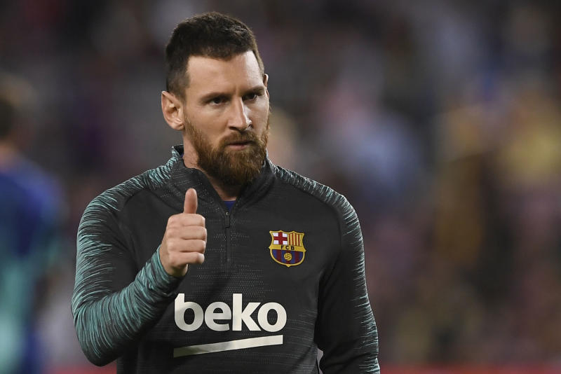 Barcelona's Argentine forward Lionel Messi warms up before the UEFA Champions League Group F football match between Barcelona and Inter Milan at the Camp Nou stadium in Barcelona, on October 2, 2019. (Photo by Josep LAGO / AFP)