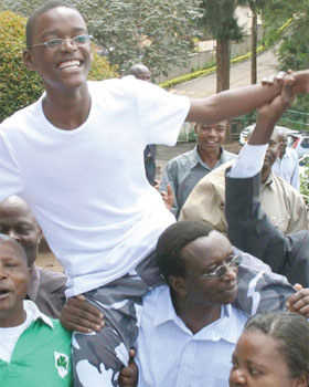 Dennis Obat Okumu of Makini Schools is feted for featuring in the top ten list of best students in KCPE exam results. [PHOTO: FILE / STANDARD]