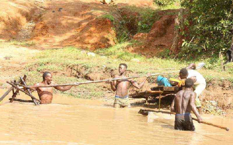 Eric Bulinda and Bryson Ambani leads their colleagues in process of looking for deposits of gold in river Isiukhu on September 16, 2022. [Benjamin Sakwa, Standard]