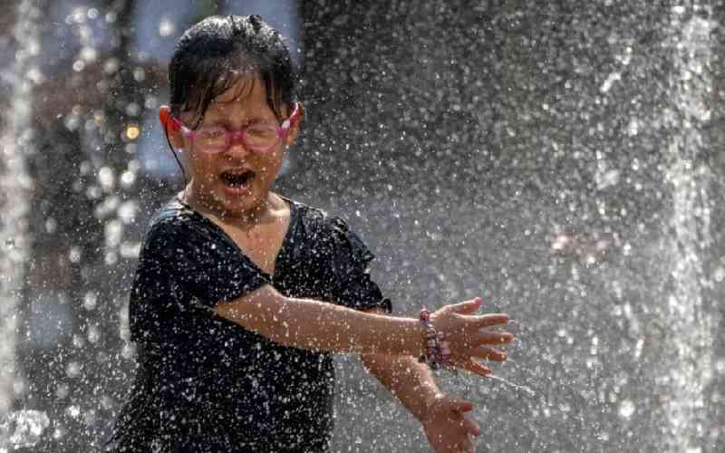 A girl reacts as she plays in a fountain at a shopping mall in Beijing, June 23, 2023. [AP Photo]