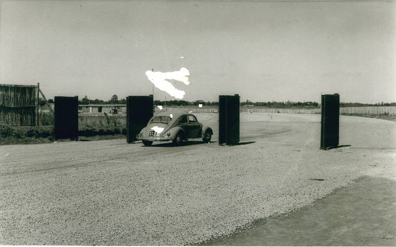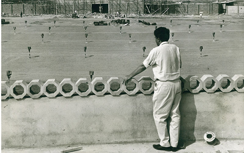 A construction supervisor leaning on the parapet of the Drive-In Cinema’s bar-restaurant as construction nears completion in 1962 [Standard]