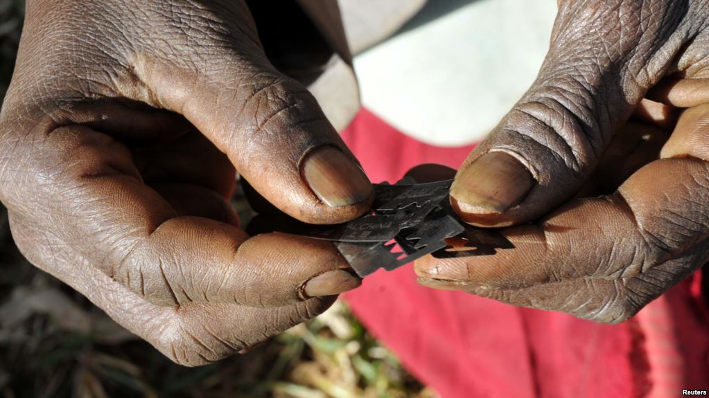 ? traditional surgeon is seen holding razor blades used to carry out female circumcision(Courtesy)