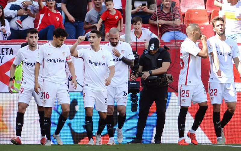 Sevilla's French forward Wissam Ben Yedder (C) celebrates after scoring a goal during the Spanish League football match between Sevilla and Athetlic Bilbao at the Ramon Sanchez-Pizjuan stadium in Sevilla on May 18, 2019. (Courtesy)