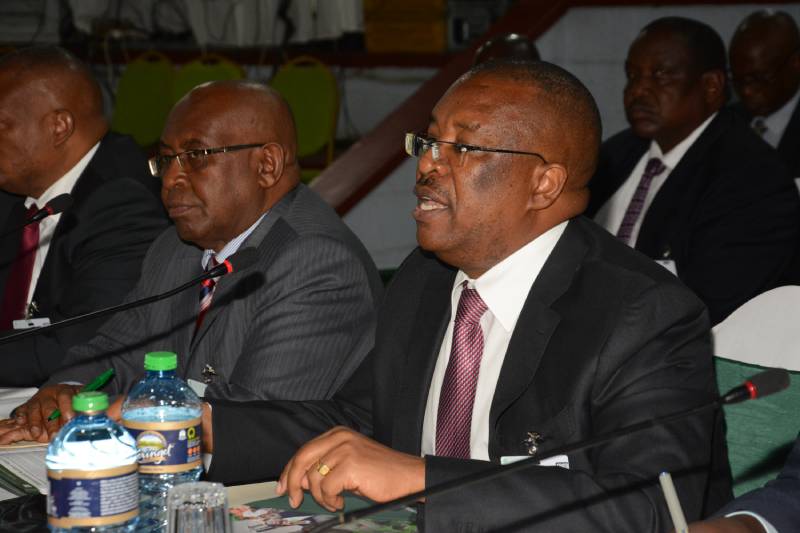 The Chairman Co-operative Bank John Murugu (right) going through the bank’s Annual Report flanked by the bank’s Managing Director Gideon Muriuki (left), Vice Chairman Macloud Malonza (second left) and bank shareholders at the Bank’s Annual General Meeting held yesterday at Bomas of Kenya.