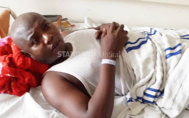 Jackton Okello who is nursing a bullet wound on his leg at Jaramogi Oginga Odinga Teaching and Referral Hospital. Nurses told him he would be discharged following the ongoing strike by medics. [Mactilda Mbenywe, Standard]