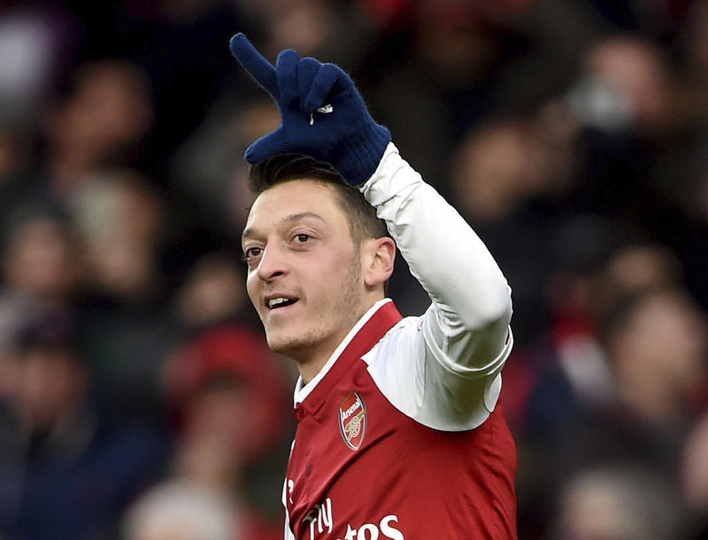 Arsenal's Mesut Ozil celebrates scoring his side's first goal of the game, during the English Premier League soccer match between Arsenal and Newcastle United, at the Emirates Stadium, in London, Saturday, Dec. 16, 2017. (Joe Giddens/PA via AP)
