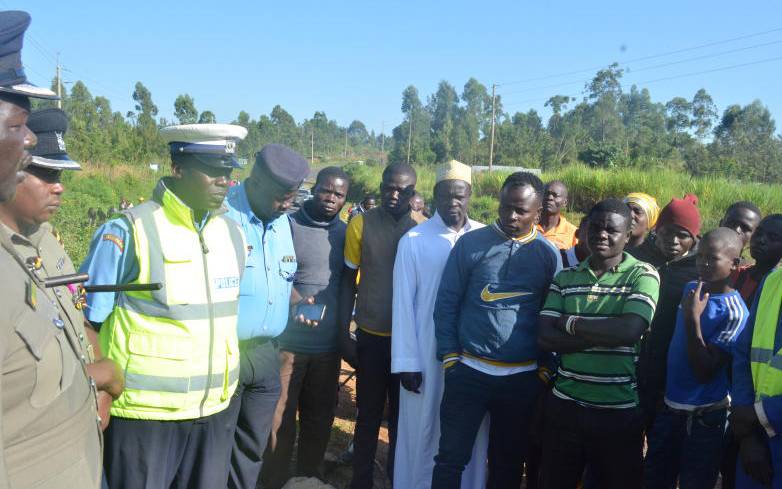 Locals talk to police officers at the scene where five people died and five others got injured in a car crash along the Buyangu-Ekero highway at River Liondwa on the morning of December 24, 2019. [Brian Kisanji, Standard]