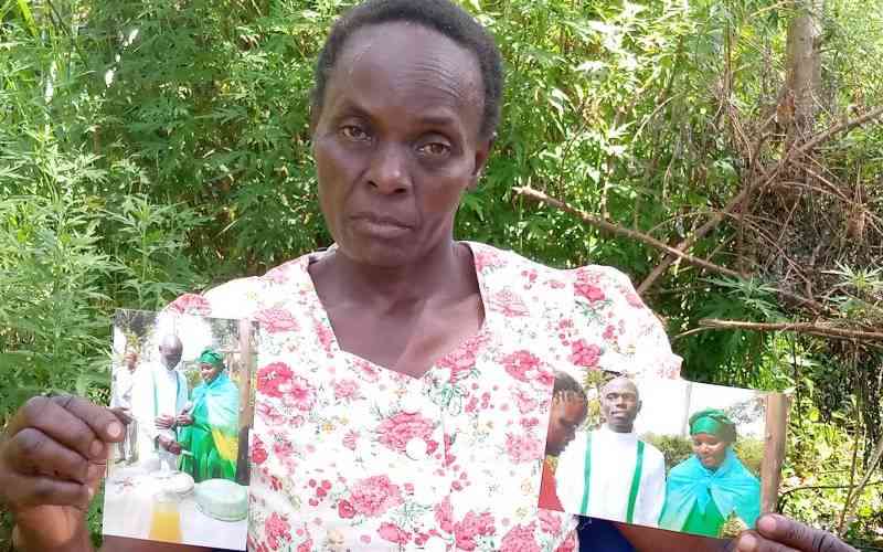 Tabitha Mukhulu holds a picture of her son Ferdinand Muhanji who died from starvation at Pastor Paul Mackenzie's church in Malindi. [Mumo Munuve, Standard]