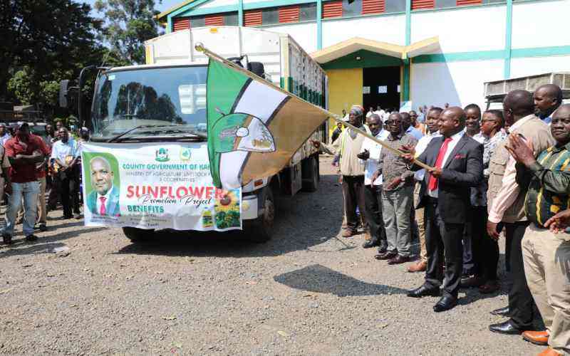 Kakamega Governor Fernandes Barasa flags off distribution of 768 pond liners worth Sh33million to boost fish farming. [Benard Lusigi,Standard].