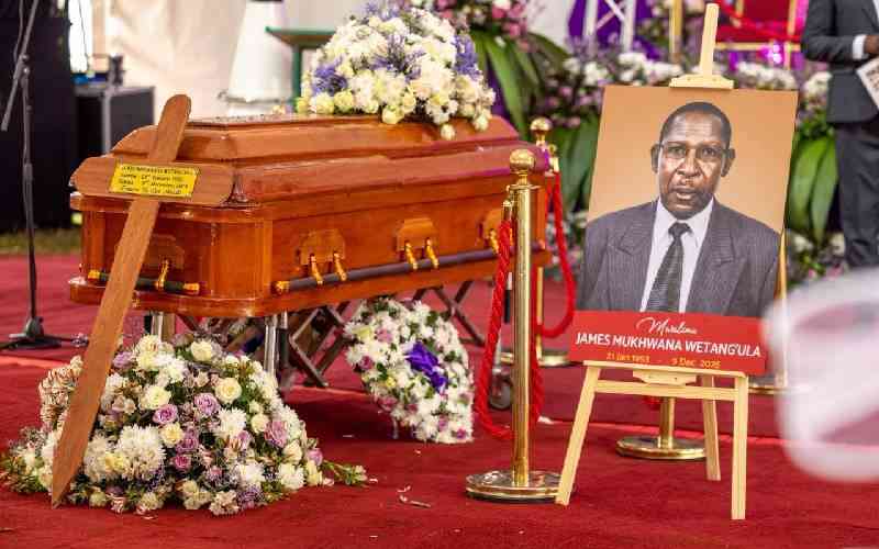 National Assembly's Speaker Moses Wetangula, Westlands MP Tim Wanyonyi and other leaders during the burial ceremony of the late Mwalimu James Mukhwana Wetangula at Tuuti I. kibabii ,Bungoma , County. The late was an elder brother to Speaker Wetangula on December 19, 2025. [SPU, Standard]