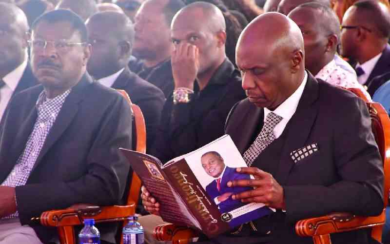Kanu Chairman Gideon Moi and National Assembly Speaker Moses Wetang'ula during the funeral service of former Lugari MP Cyrus Jirongo in Lumakanda, Kakamega County, on December 30, 2025. [Benard Lusigi, Standard]