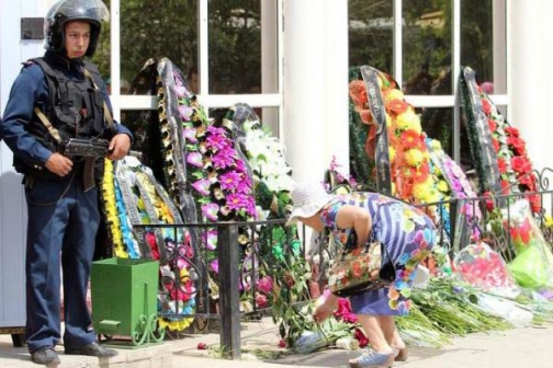 A woman places flowers outside the firearms shop, which was a target of a recent suspected Islamist militant attack, during the funeral of salesman Andrey Maksimenko in Aktobe, Kazakhstan, June 8, 2016.
