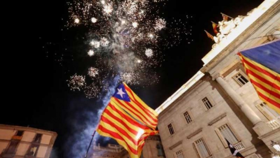Catalan separatist flags are held up as fireworks go off in Sant Jaume Square in front of the Catalan regional government headquarters during celebrations after the Catalan regional parliament declared independence from Spain in Barcelona. (Photo: Reuters)