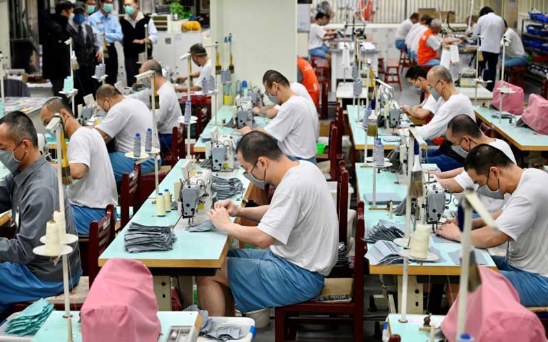 Behind the barbed wire-topped fences of Taipei Prison, a small group of inmates are hunched over clacking sewing machines, working overtime to churn out face masks and help ward off the new coronavirus.