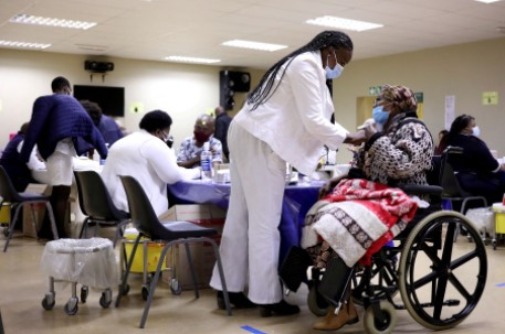 A woman receives a dose of a coronavirus disease (COVID-19) vaccine, as South Africa rolls out the coronavirus disease (COVID-19) vaccination to the elderly at the Munsieville Care for the Aged Centre outside Johannesburg, South Africa. [Reuters]