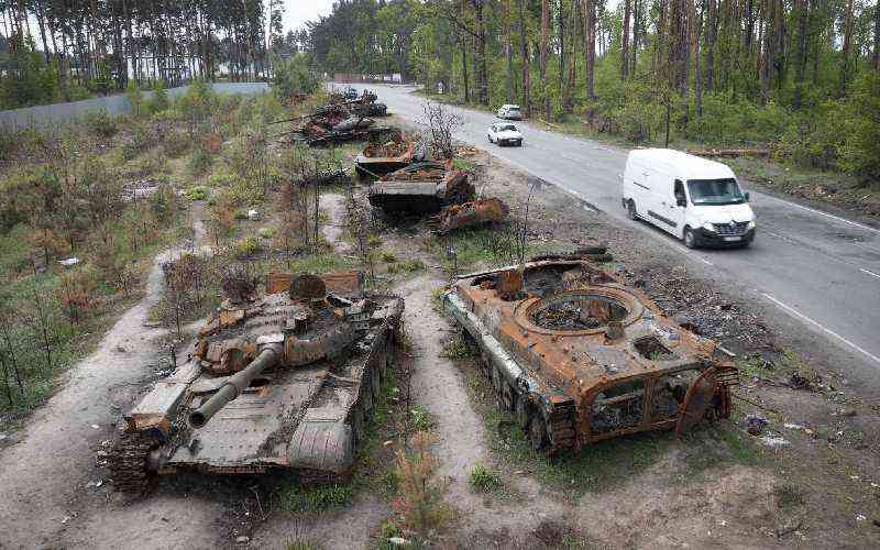 Cars pass by destroyed Russian tanks in a recent battle against Ukrainians in the village of Dmytrivka, close to Kyiv, Ukraine, on May 23, 2022. [AP Photo/Efrem Lukatsky, File]
