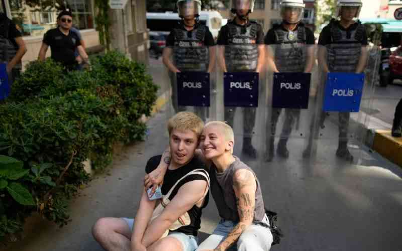 Two people sit next to a line of police officers blocking a street during the LGBTQ Pride March in Istanbul, Turkey, June 25, 2023. [AP Photo]