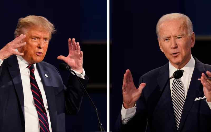 combination of photos show President Donald Trump, left, and former Vice President Joe Biden during the first presidential debate in Cleveland, Sept. 29, 2020.