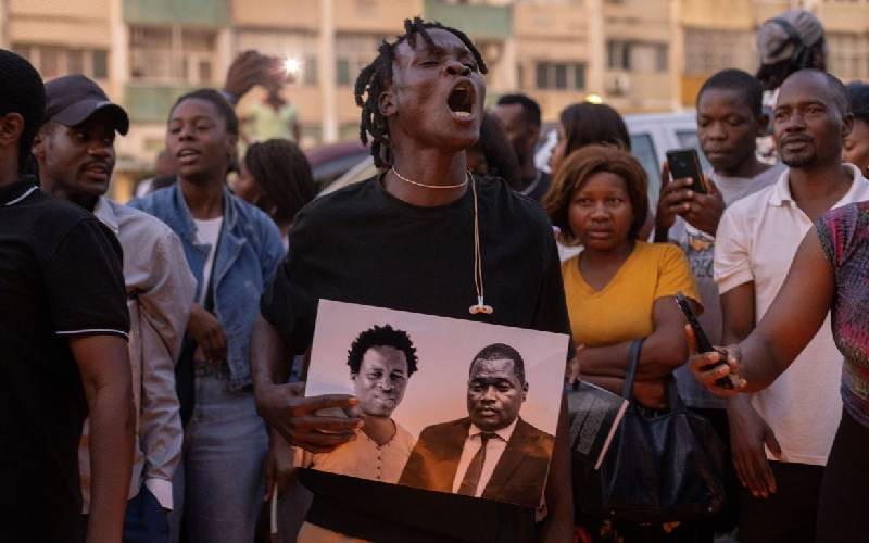 A man reacts as he holds an image of Paulo Guambe (left) and advisor and lawyer Elvino Dias (right) who were working with Mozambique's leading opposition candidate Venancio Mondlane, during a vigil after they were shot dead in Maputo on October 19, 2024. [AFP]