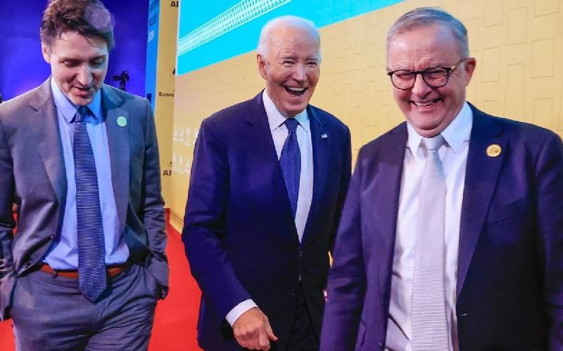 US President Joe Biden (centre), Canada's Prime Minister Justin Trudeau and Australian Prime Minister Anthony Albanese during the APEC Summit at the Convention Centre in Lima, on November 15, 2024. [AFP]