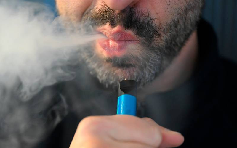A man smokes a disposable electronic cigarette in Brussels on December 12, 2024. Belgium will ban the sale of disposable e-cigarettes ('vapes') from January 1, 2025, as it received approval from the European Commission to do so. [AFP]
