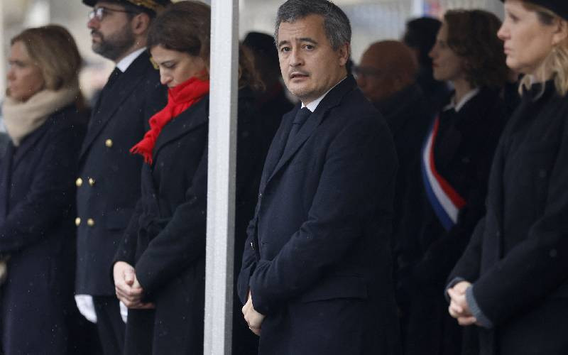 French Justice Minister Gerald Darmanin (C) attends a ceremony honoring Clarissa Jean-Philippe, a municipal police officer killed by jihadist Amedy Coulibaly, as part of a commemoration marking 10 years since an Islamist attack on the Charlie Hebdo satirical newspaper and the Hypercacher Jewish supermarket on the Richard Lenoir boulevard in Montrouge near Paris, on January 8, 2025.[AFP]
