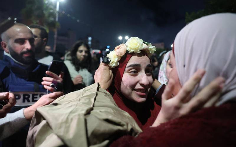 A Palestinian prisoner is welcomed by a relative upon the arrival of some 90 prisoners set free by Israel in the early hours of January 20, 2025 in the occupied West Bank town of Beitunia, on the outskirts of Ramallah. Crowds cheered, chanted and honked car horns as two buses carrying the prisoners arrived in Beitunia following their release as part of the Gaza ceasefire deal that began on January 19 and saw three Israeli hostages freed by Hamas in the Gaza Strip. [AFP,Standard]