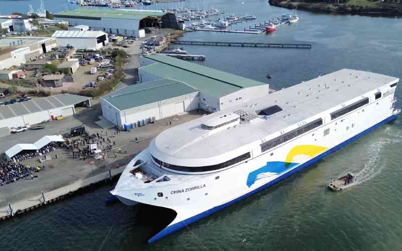 An aerial view of the launch of the Hull 096 aluminium catamaran, the world's largest battery-electric ship. May 2, 2025. [AFP]