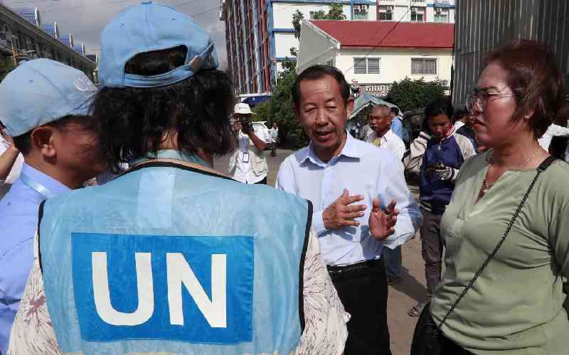 Rong Chhun (second right), an advisor of the Nation Power Party, speaks to UN officials near the Phnom Penh municipal court on May 5, 2025. [AFP]